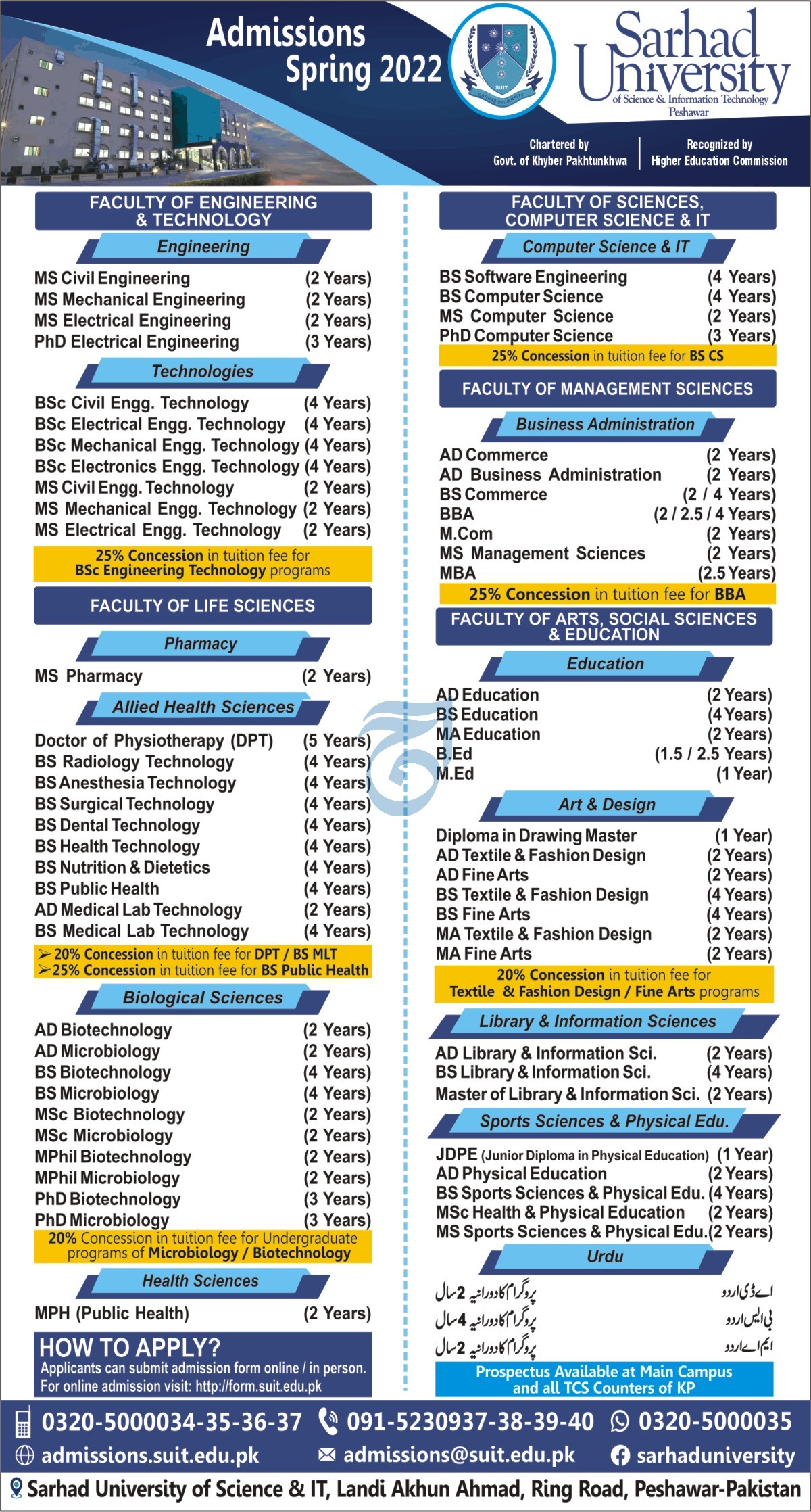 Sarhad University of Science & Information Technology BS, MS, PhD, B Sc, BBA, M Com, AD Commerce, AD Business Administration, MBA, MS Pharmacy, AD Education, MA, B Ed, M Ed, DPT, Diploma in Drawing Master, AD Fine Arts. M Phil, M Sc, JDPE, MPH admissions 2022 has been announced. Students who want to take admissions in Sarhad University of Science & Information Technology Peshawar Khyber Pakhtunkhwa KPK Pakistan for academic year 2022 to continue education in Teaching University can apply. Eligible candidates for admissions in MA, M.sc, BS, Mphil, Diploma, MS, Phd, MLIS and MBA can apply as per Private institute criteria and before closing date 28 February 2022 after reading advertisement online. Read newspaper ad for exact details.