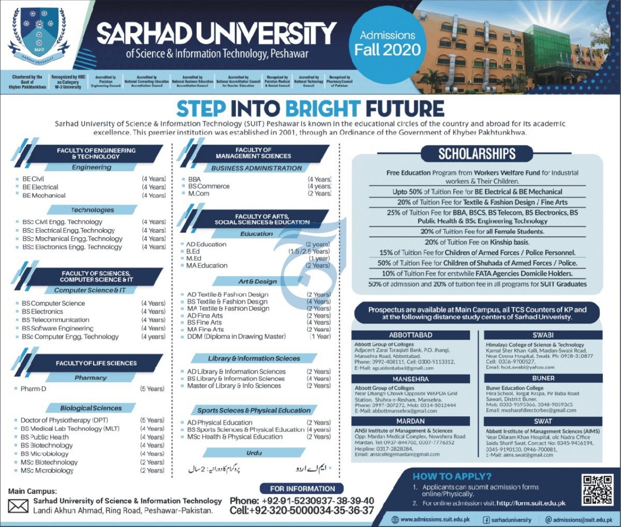Sarhad University of Science & Information Technology SUIT Peshawar has announced admissions for BE, BSc, BS, Pharm-D, DPT, BS MLT, MSc, ADP, B.Ed, M.Ed degree programs. Read newspaper ad for exact details.