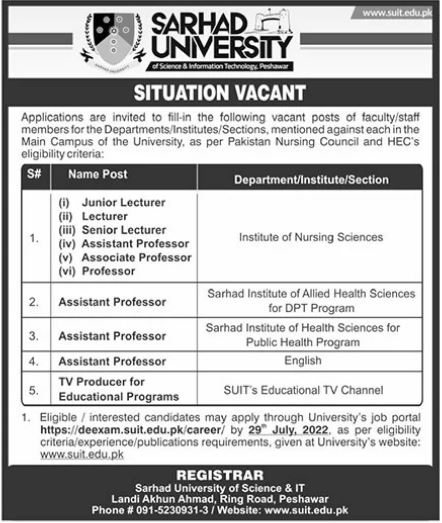 Sarhad University of Science & Information Technology invites applications for job positions advertised in daily The News dated 17 July 2022 for following vacancies in Peshawar, peshawar Khyber Pakhtunkhwa KPK Pakistan.