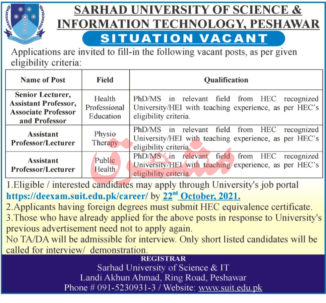 Vacancies in Sarhad University of Science & Information Technology Advertisement October 2021