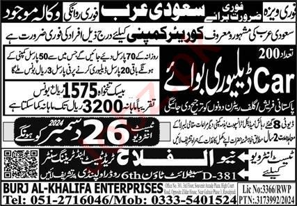 Burj Al Khalifa Enterprises jobs advertisement dated about 22 December 2024 in daily Express Newspaper invites application for the vacant post of car delivery boy in Saudi Arabia, saudi arabia Saudi Arabia. Educational qualifications required Middle and Matric etc.