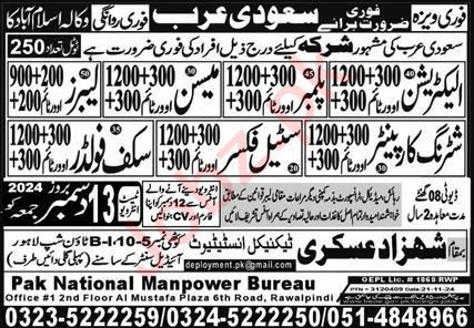 Vacant posts including Steel Fixer, Plumber, Shuttering Carpenter, Mason, Scuff Folder, Electrician and Labours are announced in Pak National Manpower Bureau Makkah, makkah Saudi Arabia as per 8 December 2024 advertisement in daily Express Newspaper. Intermediate, Primary, Middle and Matric etc. educational qualification will be preferred.