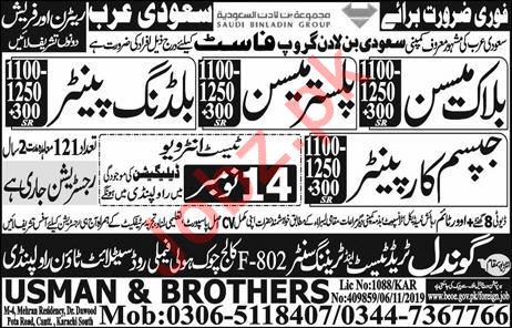 Vacancies in Usman & Brothers Advertisement November 2019