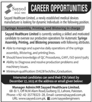 Sayyed Health Care is looking for candidates for following posts as per job advertisement published in daily Jang Newspaper of December 16, 2025 for location Gulberg 3 Lahore, lahore Punjab Pakistan: