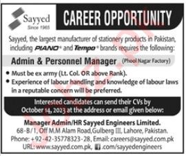 Sayyed Engineers Limited is looking for candidates for following posts as per job advertisement published in daily Jang Newspaper of October 8, 2023 for location Lahore, lahore Punjab Pakistan: