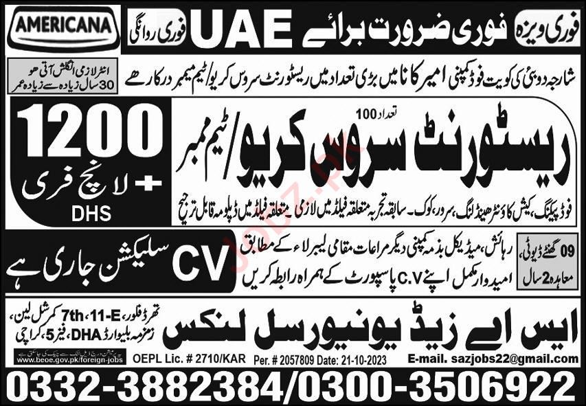 SAZ Universal Link jobs advertisement dated about 6 November 2023 in daily Express Newspaper invites application for the vacant post of restaurant service crew in Abu Dhabi, abu dhabi UAE. Preferred Education is Middle, Primary and Matric etc.
