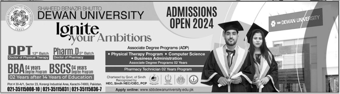 Shaheed Benazir Bhutto Dewan University DPT, Pharm D, BBA, BSCS admissions 2023 has been announced. Students who want to take admissions in Shaheed Benazir Bhutto Dewan University Karachi Sindh Pakistan for academic year 2023 to continue education in Management University can apply. Eligible students for fulfilling criteria for admissions in DPT, BS, Pharm D and BBA can enroll as per Private admission policy 2023 till closing date 27 January 2024. Read newspaper ad for exact details.