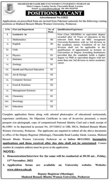 Shaheed Benazir Bhutto Women University Peshawar, peshawar Khyber Pakhtunkhwa KPK Pakistan invites applications from eligible candidates for the post of lecturer management sciences, lecturer physical education, lecturer, lecturer art design, lecturer physics, lecturer chemistry, lecturer zoology, lecturer sociology, lecturer health, lecturer education, lecturer mathematics, lecturer english, lecturer urdu, lecturer statistics, lecturer food nutrition and lecturer computer science as per advertisement of November 5, 2022 published in daily The News Newspaper. Educational qualifications required MS, Phd, Master and Mphil etc.