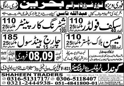 Vacant posts including plaster mason, scaffolder, block mason, charge hand civil and shuttering carpenter are announced in Shaheen Traders Bahrain, bahrain Bahrain as per 6 February 2023 advertisement in daily Express Newspaper. Middle, Matric and Intermediate etc. educational qualification will be preferred.