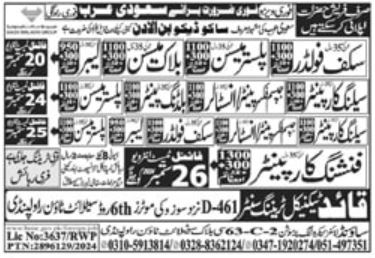 Sound Lines Recruiting Promotion Riyadh, riyadh Saudi Arabia invites applications from eligible candidates for the post of scaffolder, plaster mason, block mason, gypsum painter, labor, building painter, ceiling carpenter, gypsum installer and finishing carpenter as per advertisement of September 18, 2024 published in daily Mashriq Newspaper. Matric and Middle etc. educational qualification will be preferred.