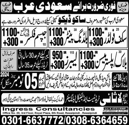 Ingress Consultancies Overseas Employment Promoters Saudi Arabia, saudi arabia Saudi Arabia invites applications from eligible candidates for the post of gypsum fixer, plaster mason, labor, block mason, scaffolder and building painter as per advertisement of October 29, 2024 published in daily Express Newspaper. Candidates with Intermediate, Middle, Matric and DAE etc. educational background will be preferred.