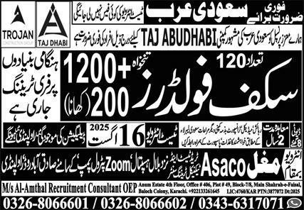 Mughal Asaco Trade Test & Technical Training Center is looking for candidates for following posts as per job advertisement published in daily Express Newspaper of August 13, 2025 for location Jeddah, dammam Saudi Arabia: