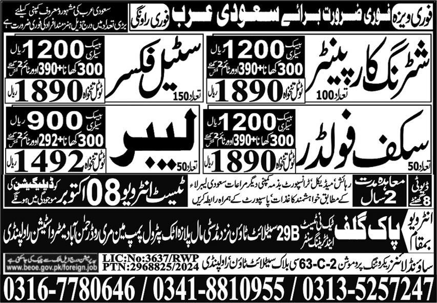Pak Gulf Tec Ni Test & Training Center Riyadh, dammam Saudi Arabia invites applications from eligible candidates for the post of labor, steel fixer, scaffolder and shuttering carpenter as per advertisement of October 5, 2024 published in daily Express Newspaper. Candidates with Matric, Intermediate and Middle etc. educational background will be preferred.
