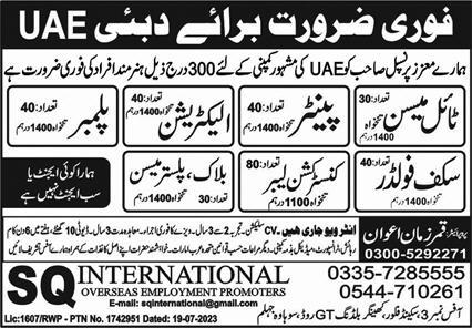 SQ International OEP Abu Dhabi, dubai UAE invites applications from eligible candidates for the post of block mason, construction labor, tile mason, painter, scaffolder, plumber, electrician and plaster mason as per advertisement of August 3, 2023 published in daily Express Newspaper. Preferred Education is Intermediate and Matric etc.