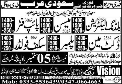 Vision Technical Training Center is looking for candidates for following posts as per job advertisement published in daily Express Newspaper of August 23, 2025 for location Riyadh, tabuk Saudi Arabia: