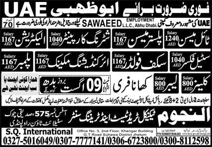 SQ International Agency is looking for candidates for following posts as per job advertisement published in daily Express Newspaper of August 8, 2023 for location Abu Dhabi, sharjah UAE: