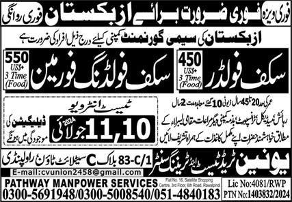 Vacant posts including scaffolder and scaffolding foreman are announced in Union Trade Test and Training Center Tashkent, tashkent Uzbekistan as per 9 July 2024 advertisement in daily Express Newspaper. Preferred Education is Intermediate and Matric etc.