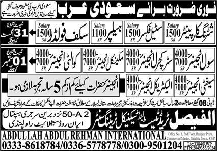 Apply at Al Faisal Trade Test & Technical Training Center latest Overseas jobs in Engineering and departments before closing date which is around September 1, 2024 or as per closing date in newspaper ad. Read complete ad online to know how to apply on latest Al Faisal Trade Test & Technical Training Center job opportunities. Learn today extra skills including Civil Engineering, Structural Engineering, Carpentry and Mechanical Engineering to get these Al Faisal Trade Test & Technical Training Center jobs. Salary varies from 517000. Overtime might be allowed. Free medical, transport and accommodation may be available.