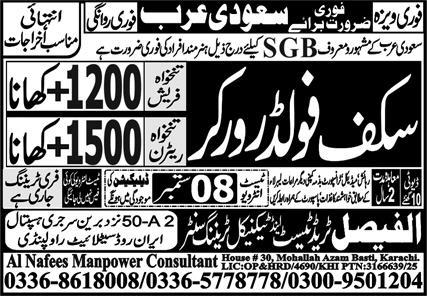 Apply at Al Nafees Manpower Consultant latest Overseas jobs in Manufacturing and departments before closing date which is around September 8, 2025 or as per closing date in newspaper ad. Read complete ad online to know how to apply on latest Al Nafees Manpower Consultant job opportunities. Salary varies from 113000.
