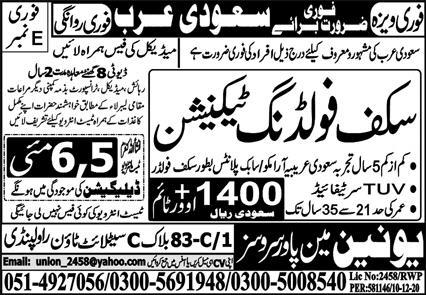 Union Manpower Services jobs advertisement dated about 4 May 2023 in daily Express Newspaper invites application for the vacant post of scaffolding technician in Jeddah, riyadh Saudi Arabia. Candidates with DAE, Intermediate and Matric etc. educational background will be preferred.