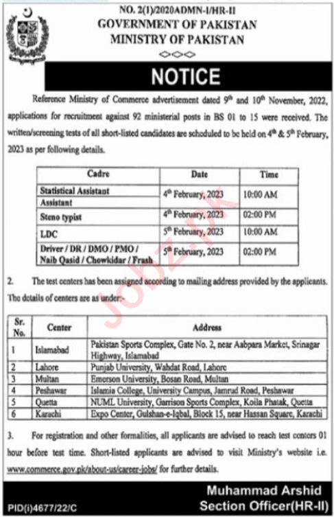 Vacant posts including frash, naib qasid, ldc, stenotypist, driver, statistical assistant, chowkidar and assistant are announced in Ministry of Commerce Islamabad, islamabad, karachi, lahore, peshawar, multan and quetta Islamabad Pakistan as per 29 January 2023 advertisement in daily Nawaiwaqt Newspaper. Preferred Education is Master, Middle, Primary and Bachelor etc.