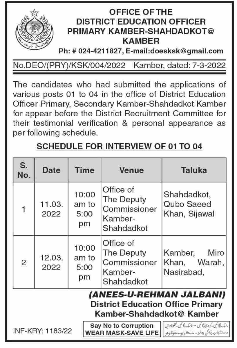 District Education Officer Qambar Shahdadkot, qambar shahdadkot Sindh Pakistan invites applications from eligible candidates for the post of driver, sanitary worker, naib qasid and sweeper as per advertisement of March 10, 2022 published in daily Dawn Newspaper. Persons with Primary and Middle etc. education can apply.