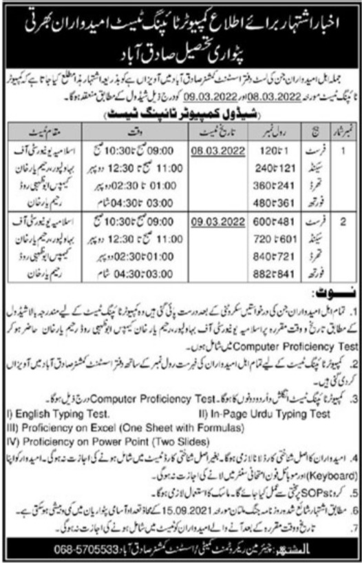 Revenue Department invites applications for job positions advertised in daily Khabrain dated 24 February 2022 for following vacancies in Sadiqabad, rahim yar khan and sadiqabad Punjab Pakistan.