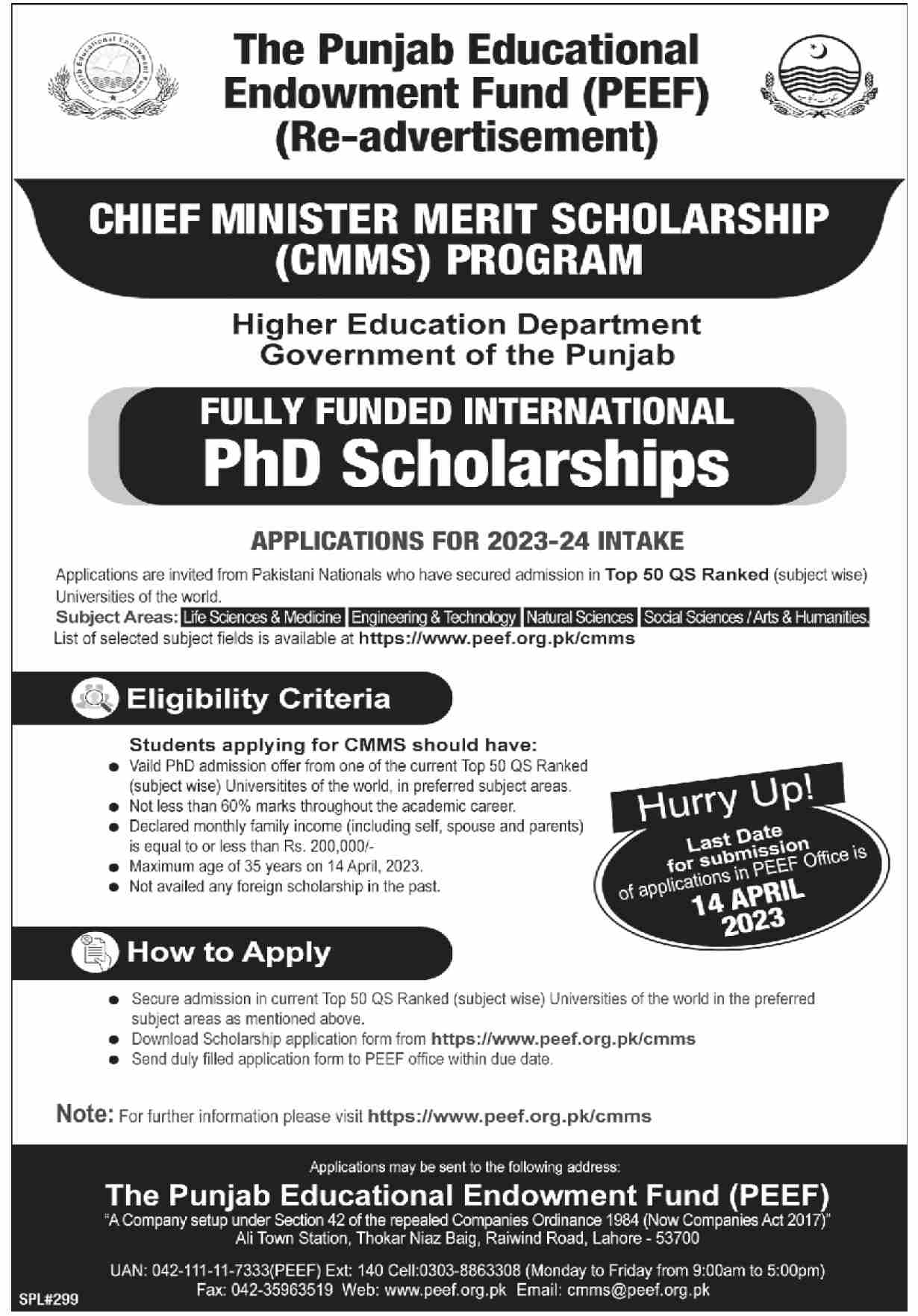 Admissions in The Punjab Educational Endowment Fund PEEF 2023 for Phd Scholarship has been announced. Eligible students can apply for academic admissions 2023 in The Punjab Educational Endowment Fund PEEF Lahore Punjab Pakistan for Science University. Eligible students for fulfilling criteria for admissions in can enroll as per Government admission policy 2023 till closing date 14 April 2023. Read newspaper ad for exact details.