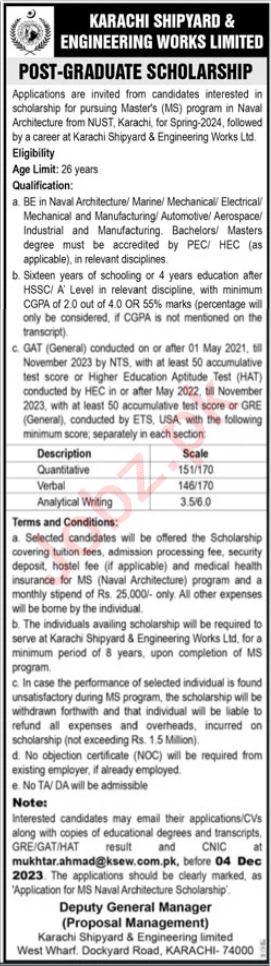 Vacancies in Karachi Shipyard and Engineering Works Limited Advertisement November 2023