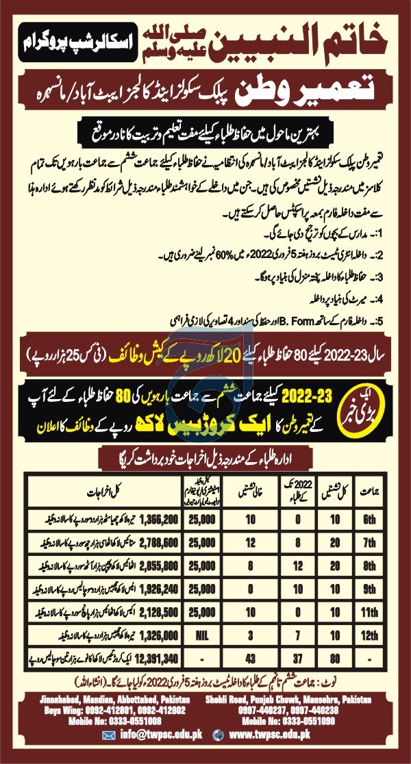 Scholarships for Huffaz Students from class 6 to 12 at Tameer E Watan Schools