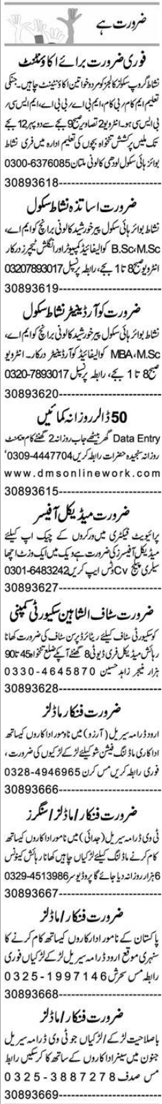Vacant posts including coordinator, english teacher, computer teacher, actor, security staff, medical officer, singer, doctor, school coordinator, teacher, model, accountant and data entry operator are announced in Private Company Multan, multan Punjab Pakistan as per 26 September 2024 advertisement in daily Express Newspaper. Preferred Education is Middle, Matric, Intermediate, MBBS, M.com, MA, BA, B.com, M.sc and Bachelor etc.