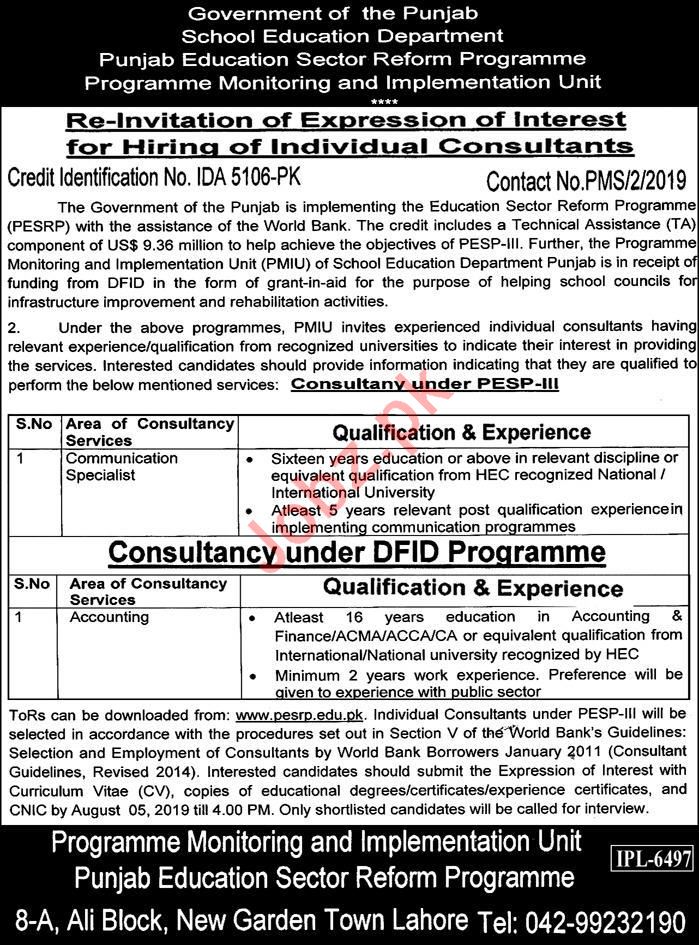 Government of The Punjab School Education Department Punjab Education Sector Reform Programme, Programme Monitoring And Implementation Unit is looking for qualified and well educated candidates for the positions of Communication Specialist & Accountant in Lahore.