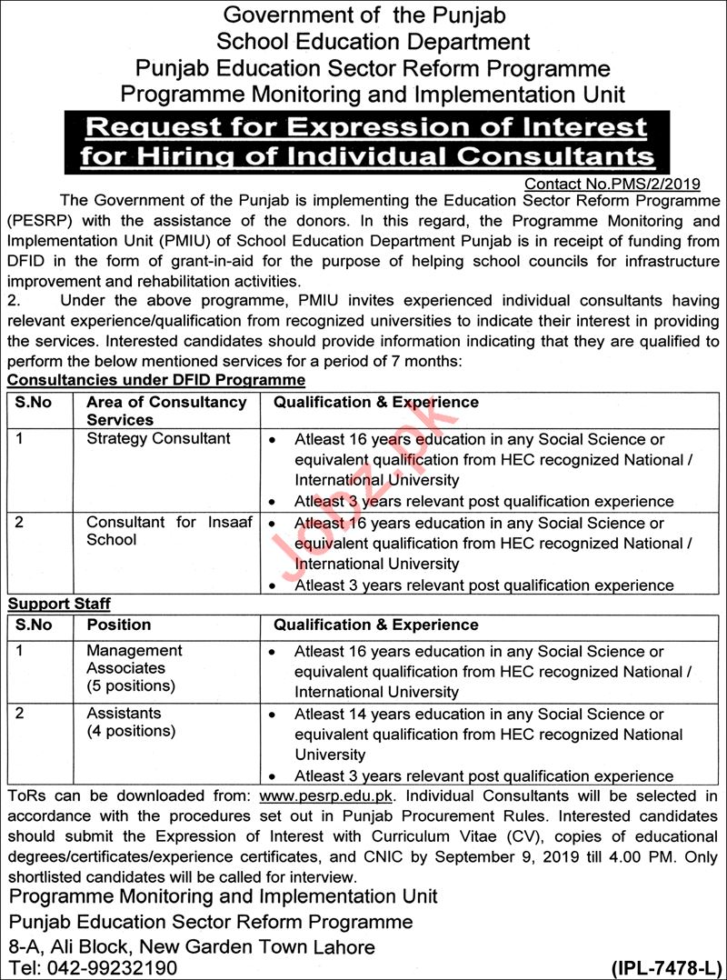 Government of The Punjab, School Education Department, Punjab Education Sector Reform Programme, Programme Monitoring & Implementation Unit required qualified and well experienced candidates for the posts of Strategy Consultant, Insaaf School Consultant, Management Associates & Assistants in Lahore.