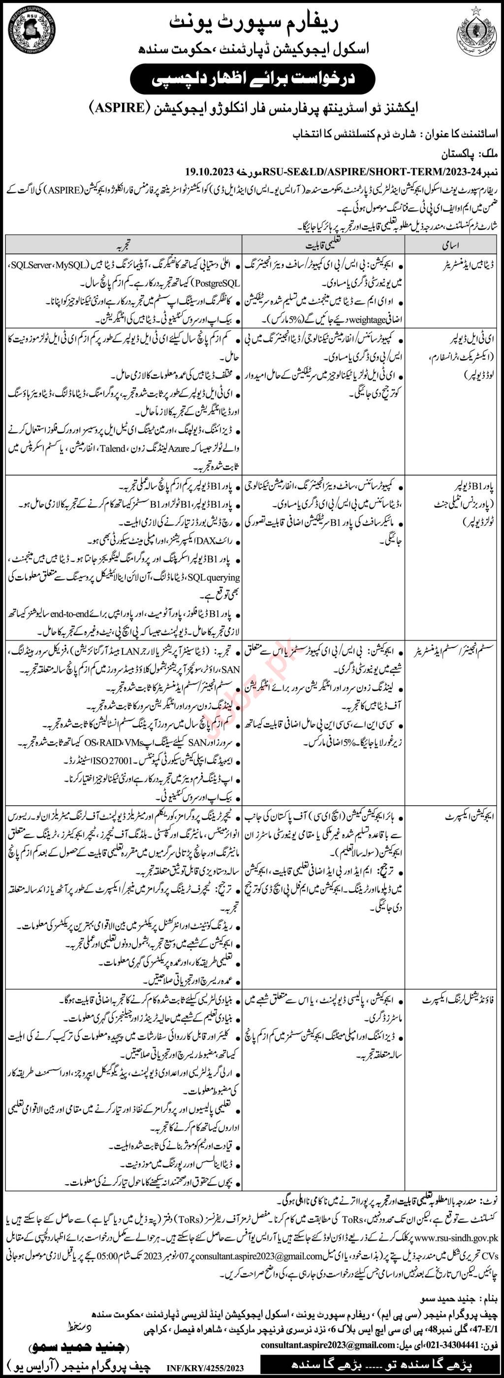 Vacant posts including Foundation Learning Expert, Power Bone Developer, System Administrator, Education Expert, Etl Developer, System Engineer and Database Administrator are announced in School Education Department Karachi, karachi Sindh Pakistan as per 22 October 2023 advertisement in daily Express Newspaper. Educational qualifications required Bachelor, Matric and Intermediate etc.