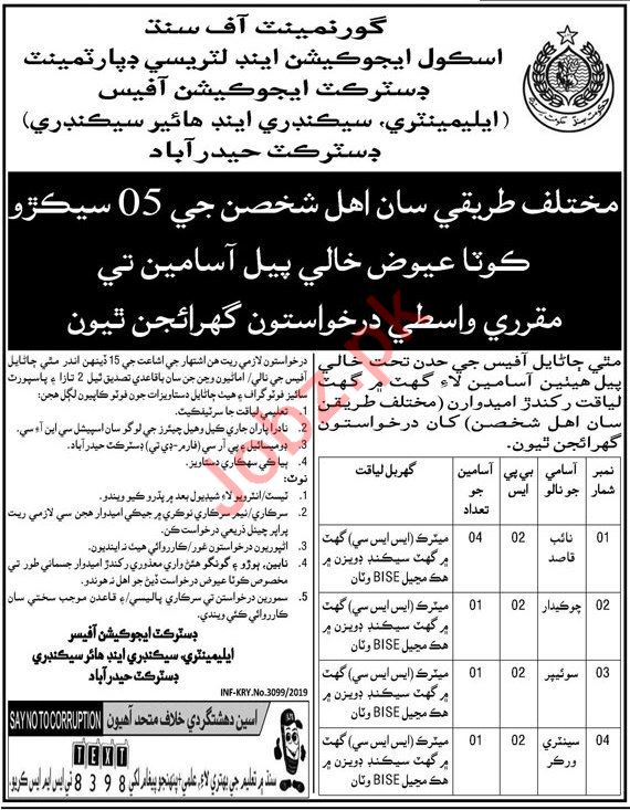 School Education & Literacy Department District Education Office Elementary, Secondary & Higher Secondary Government of Sindh is looking for experienced and energetic candidates for the positions of Naib Qasid, Chowkidar, Sweeper, Sanitary Worker in District Hyderabad Sindh 2019.