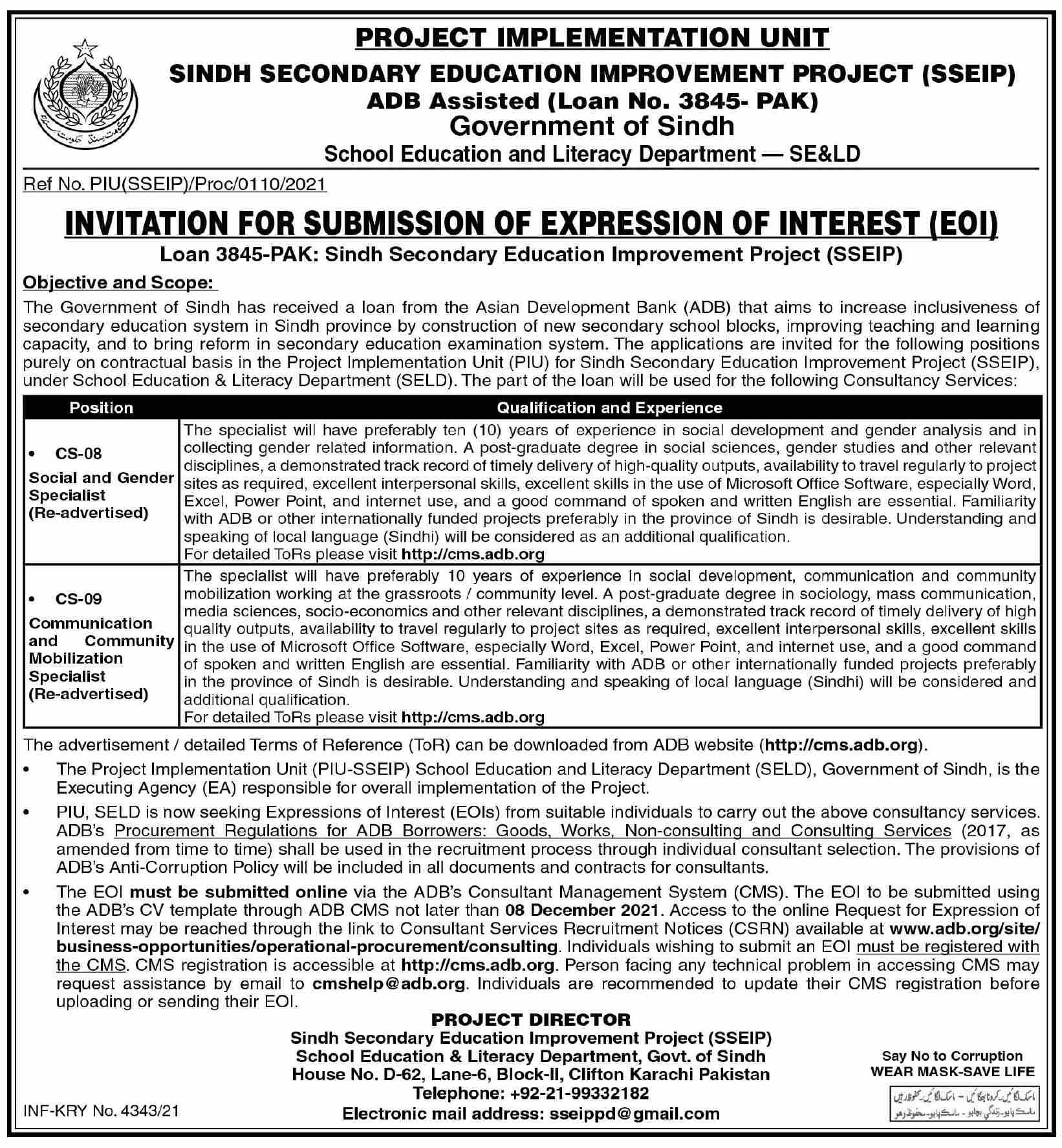 Vacancies in Sindh Secondary Education Improvement Project Advertisement November 2021