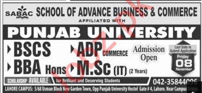 School of Advance Business & Commerce SABAC has announced admissions in BS Computer Science, BBA, M.Sc Information Technology, Associate Degree Program ADP in Commerce in Lahore. School of Advance Business & Commerce SABAC is affiliated with Punjab University. Read newspaper ad for exact details.