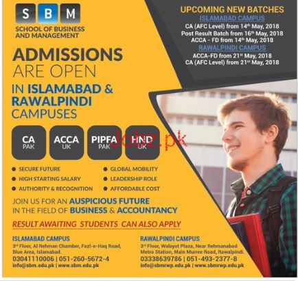 School of Business and Management SBM Admission in CA, ACCA, PIPFA and HND in Islamabad and Rawalpindi. Result Awaiting students also can apply fro Admission. Read newspaper ad for exact details.