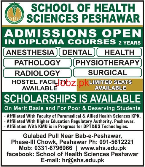 School of Health Sciences Peshawar Admission in Diploma in Anesthesia, Dental, Health, Pathology, Physiotherapy, Radiology and Surgical 2 year Diploma in Peshawar. Read newspaper ad for exact details.