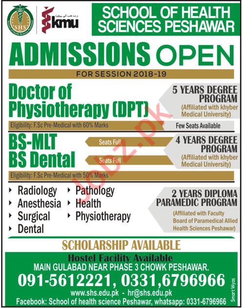 School of Health Sciences SHS Peshawar, Pakistan are announced admissions for academic session 2018-2019 for the classes of DPT Doctor of Physical Therapy, BS MLT, BS Dental. Read newspaper ad for exact details.