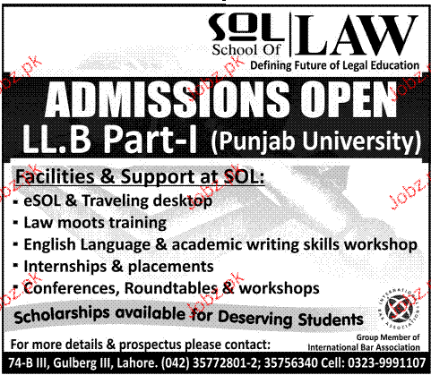 School of Law Admission in LLB Part-I in Lahore. Read newspaper ad for exact details.