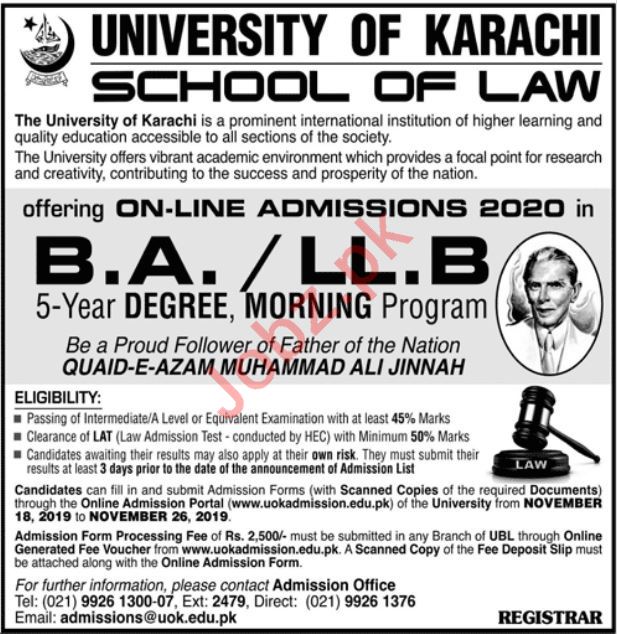 School of Law has announced admissions in BA, LLB 5 year degree morning program in Karachi. School of Law is affiliated with University of Karachi. For further information contact on 021-99261300-07 Read newspaper ad for exact details.