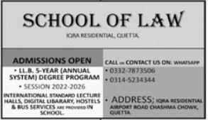 School of Law 5 Year Annual System LLB Program admissions 2022 has been announced. Eligible students who qualify as per admission criteria in School of Law Quetta Balochistan Pakistan can apply in Law College for academic year 2022. Students for admissions in LLb & criteria can apply as per Private institute admission policy 2022 before closing date July 12, 2022 as per advertisement. Read newspaper ad for exact details.