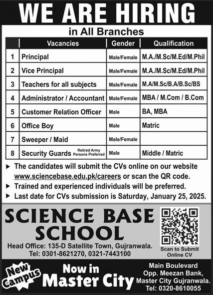 Science Base School invites applications for job positions advertised in daily Express dated 21 January 2025 for following vacancies in Gujranwala, gujranwala Punjab Pakistan.