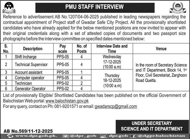 Science & Information Technology Department invites applications for job positions advertised in daily Express dated 12 December 2025 for following vacancies in Zarghun Road Quetta, quetta Balochistan Pakistan.