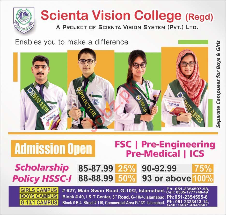 Scienta Vision College Islamabad, Pakistan are announcing admissions fall 2019 for the classes of FA Fine Arts, I Com, DIT, FA, ICS, F Sc Pre Medical & Pre Engineering. Read newspaper ad for exact details.