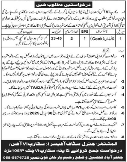 Scrap VI Rahim Yar Khan, rahim yar khan Punjab Pakistan invites applications from eligible candidates for the post of khansama and cook as per advertisement of April 17, 2025 published in daily Khabrain Newspaper. Middle, Primary and Matric etc. educational qualification will be preferred.