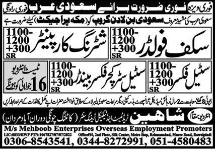 Shaheen Trade Test & Training Center is looking for candidates for following posts as per job advertisement published in daily Express Newspaper of July 15, 2022 for location Madina, makkah Saudi Arabia: