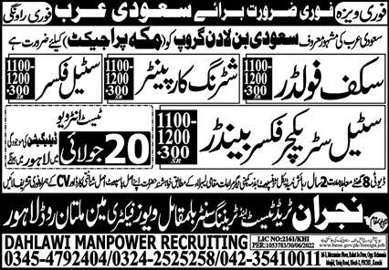 Dahlawi Manpower Recruiting jobs advertisement dated about 18 July 2022 in daily Express Newspaper invites application for the vacant post of steel fixer, steel structure fixer, scuff folder and shuttering carpenter in Makkah, makkah Saudi Arabia. Persons with Middle and Matric etc. education can apply.