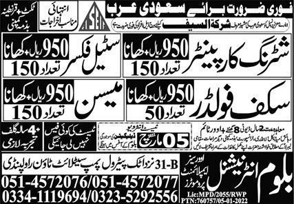 Bloom International Overseas Employment Promoter OEP is looking for candidates for following posts as per job advertisement published in daily Express Newspaper of March 2, 2022 for location Dammam, dammam Saudi Arabia:
